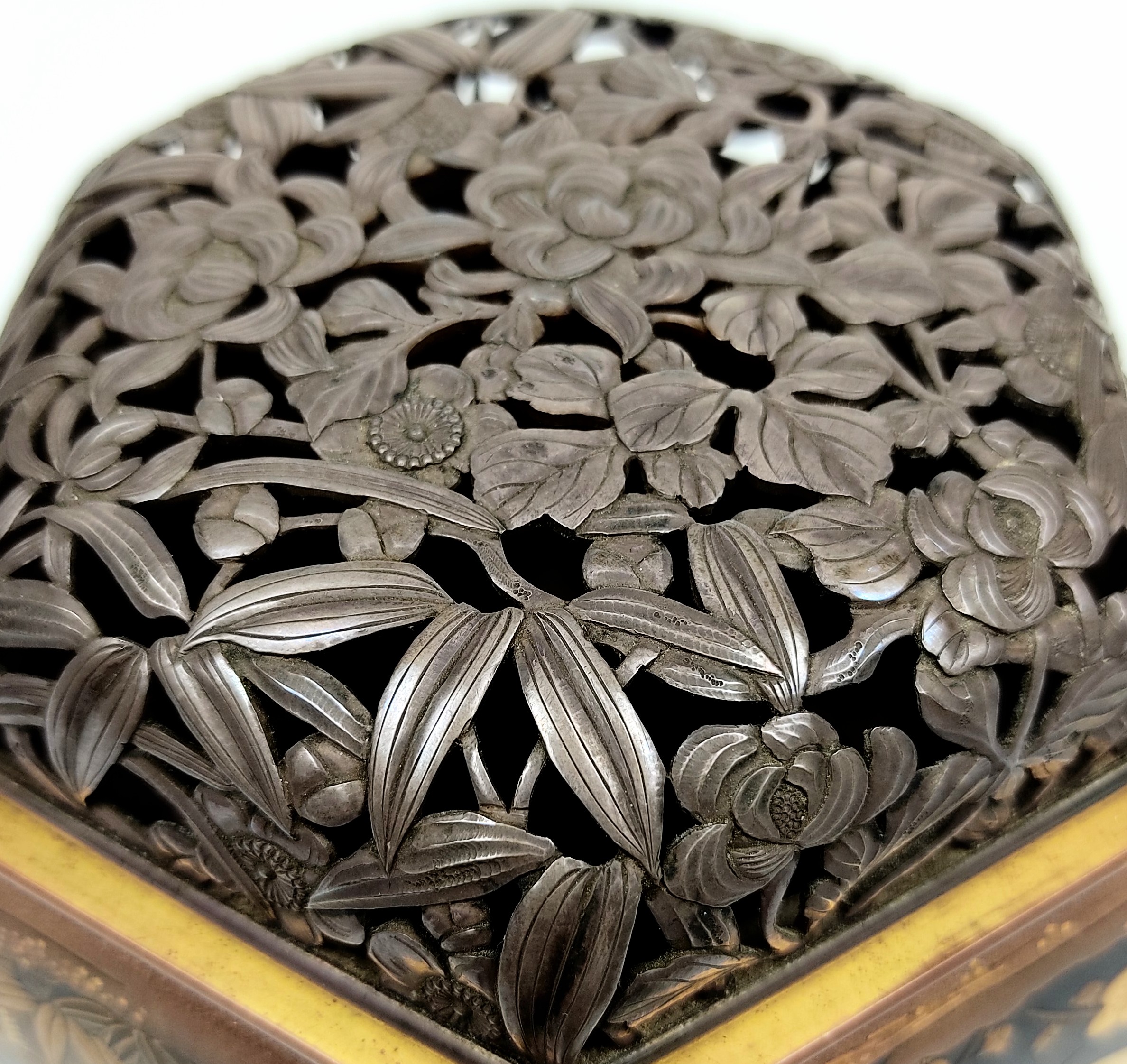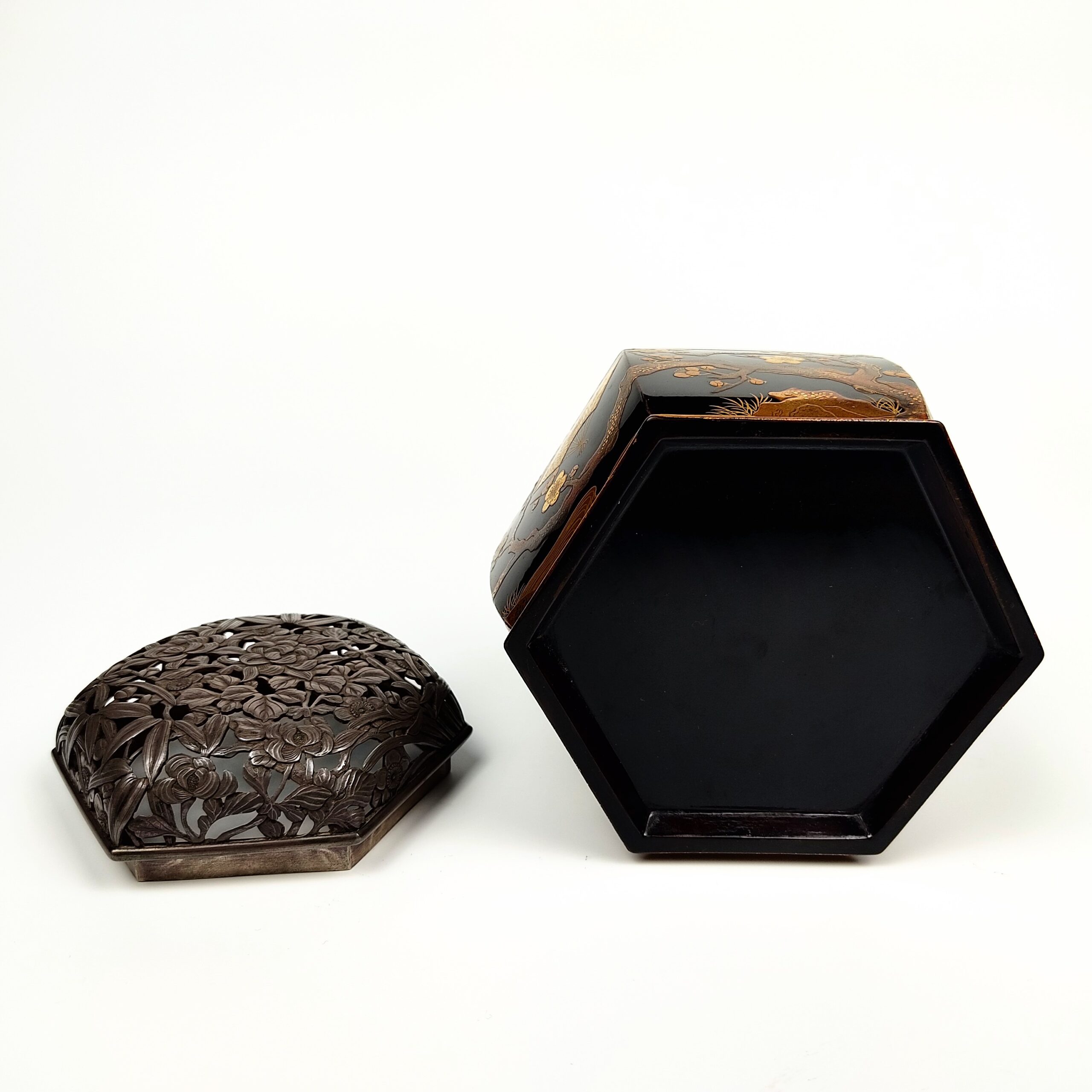 Hexagon shape incense burner with gold lacquer decoration of pine,bamboo,plum,tachibana and fan.with carved silver chimny