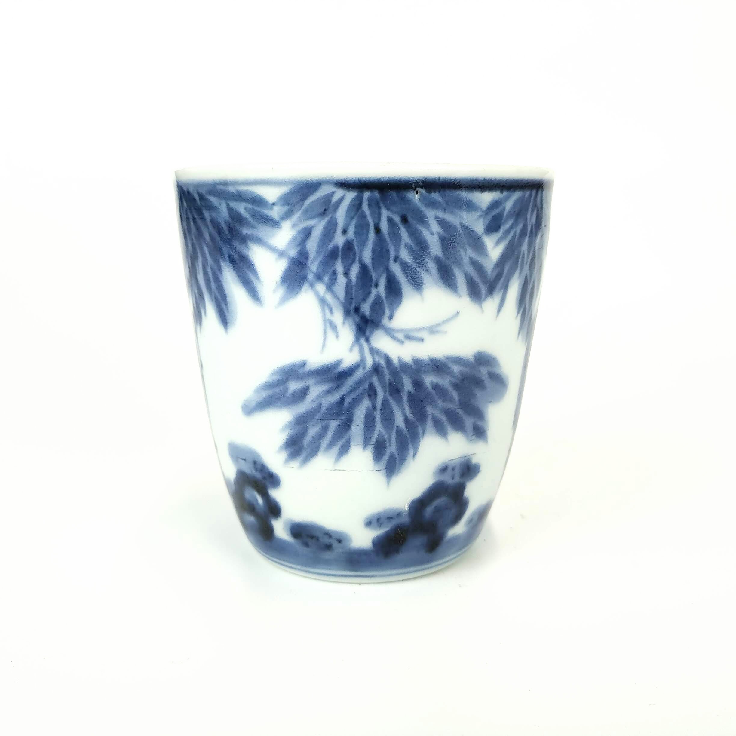 Imari blue and white soba cup with design of sage in bamboo bush