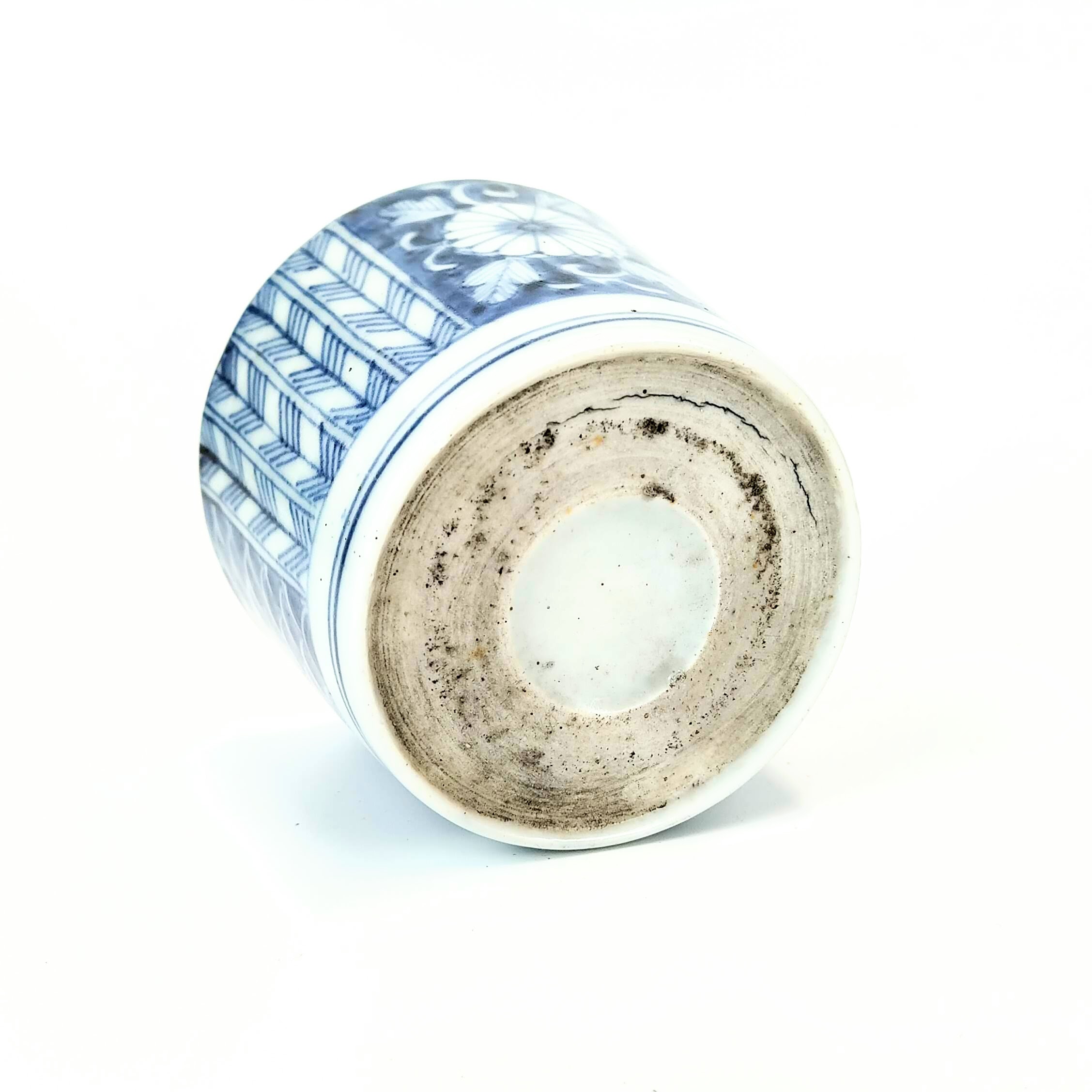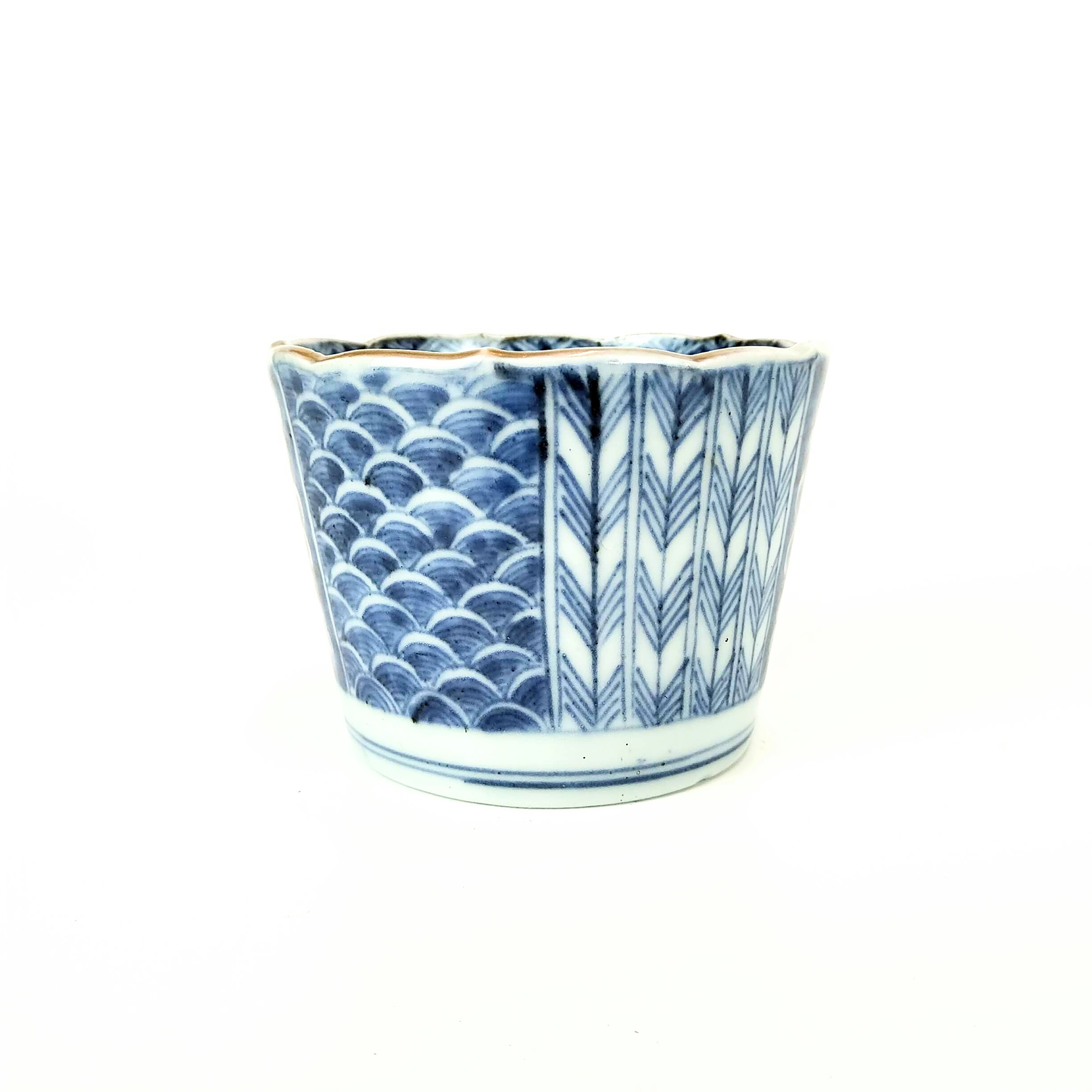 Imari ware blue and white soba cup with design of chrysamthemum,feathers of an arrow and wave pattern