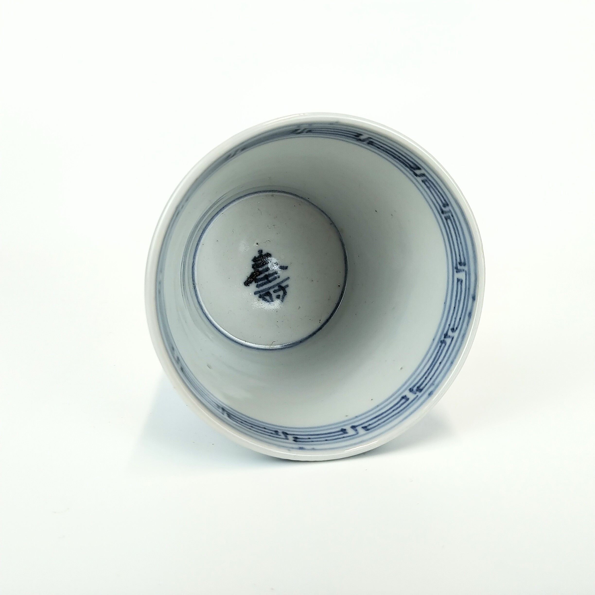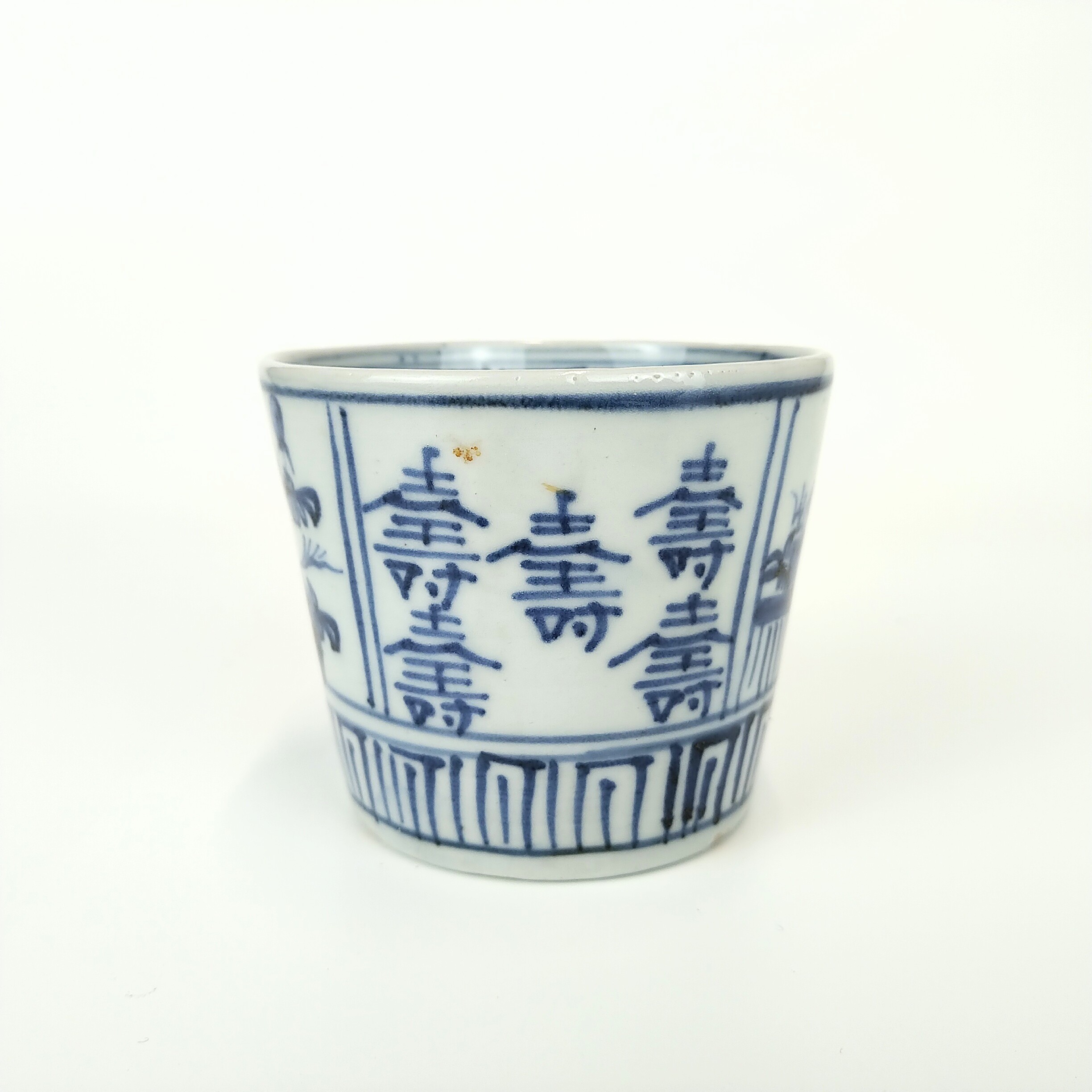 Imari ware blue and white soba cup with design of Kotobuki character,hedge and flower
