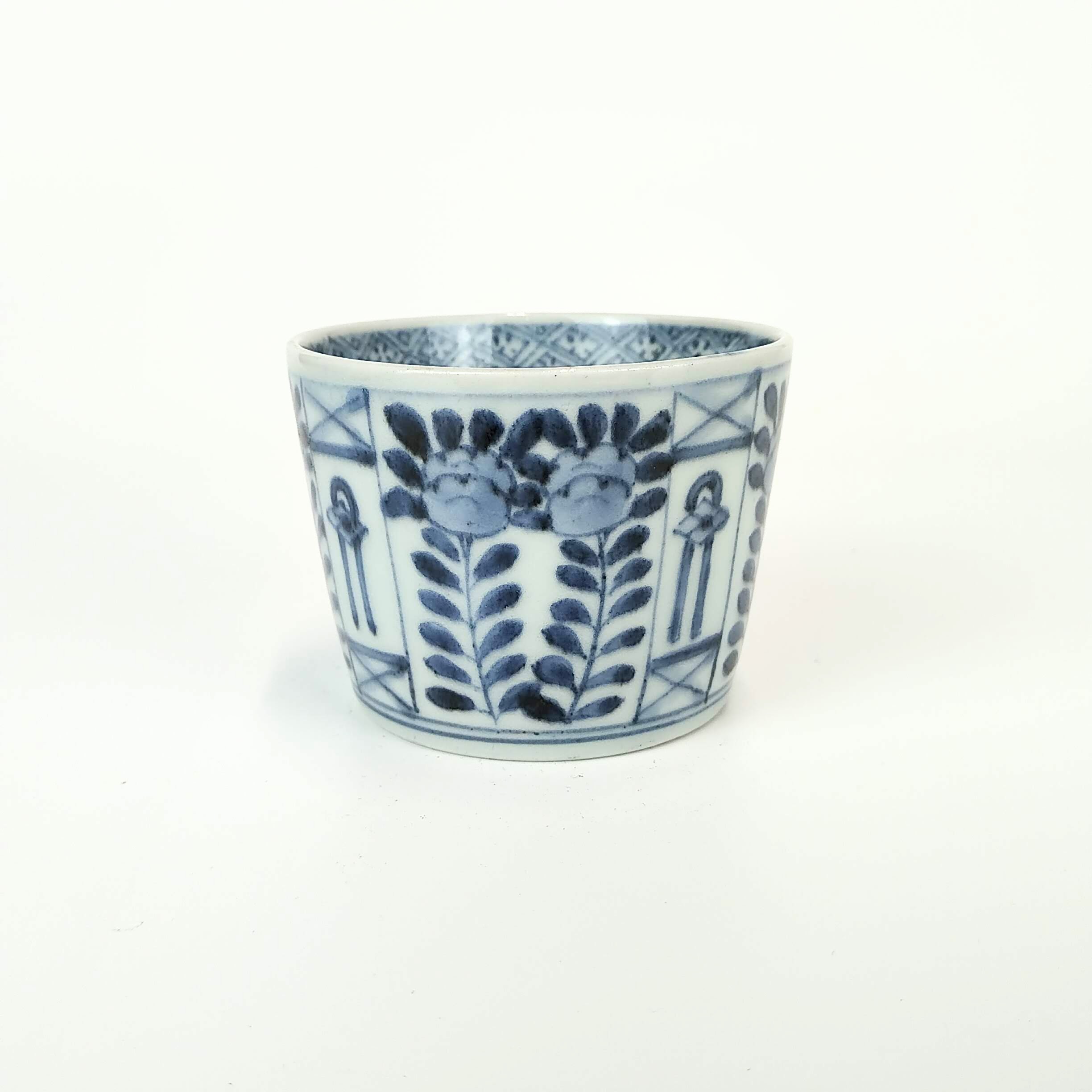 Imari ware blue and white sobacup with design of flower