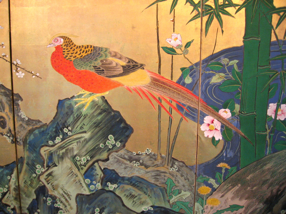 Six hold paper screen painted in ink and color on a gold ground with flowers and birds