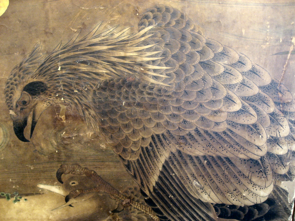 two hold paper screen painted in ink and color on a gold ground with pine tree and hawk
