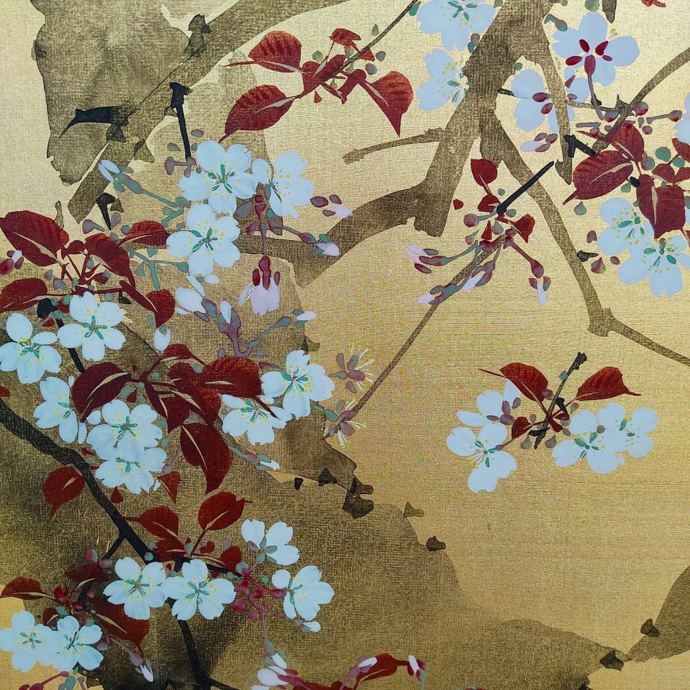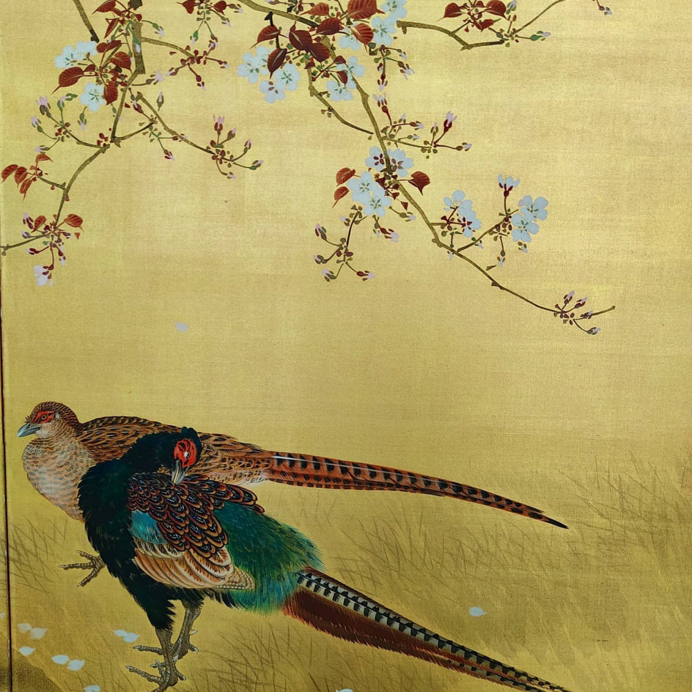 Two hold Silk screen painted in ink and color on a gold ground with cherry blossoms and pheasants