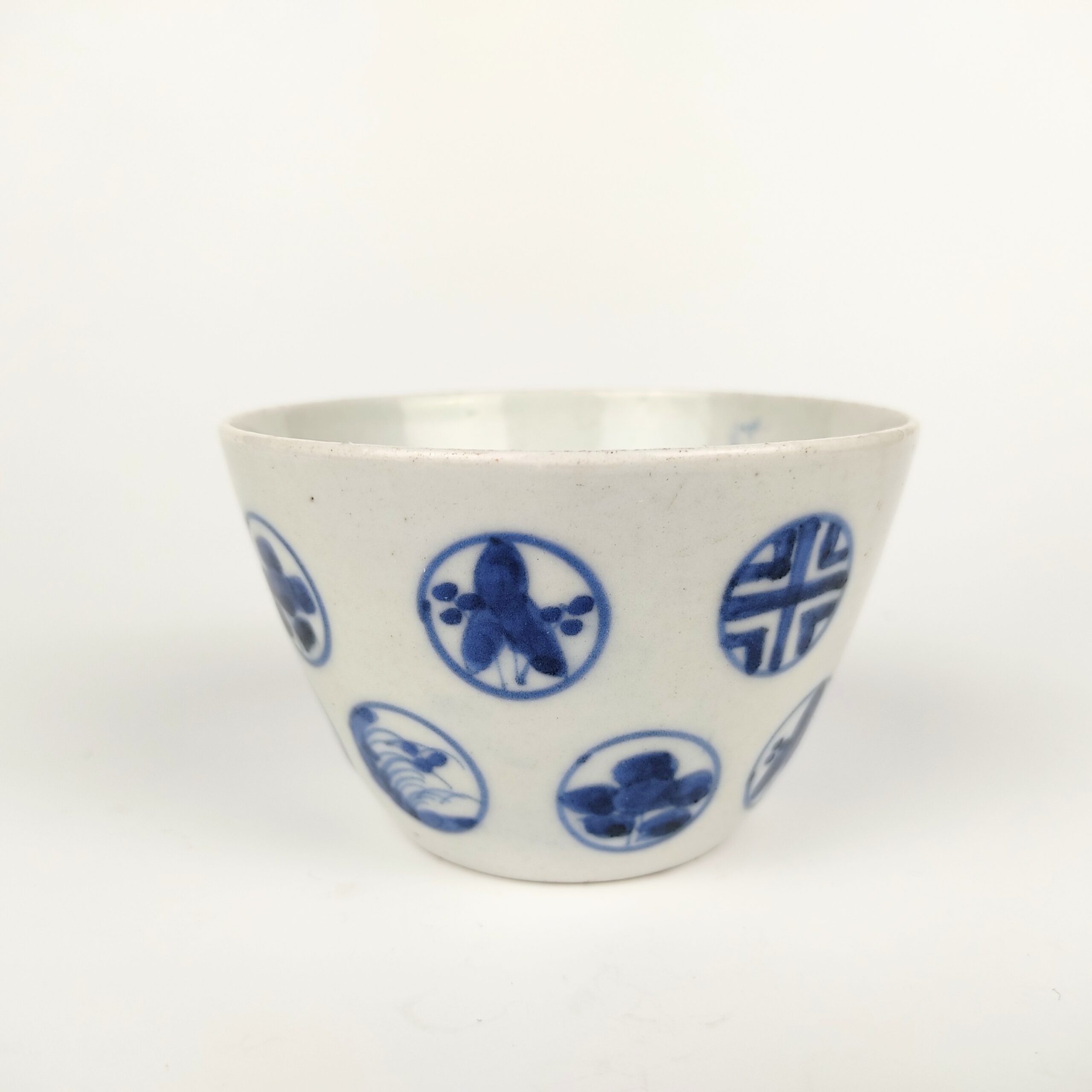 サイズ:直径9.5cm 高さ6cm 時代: 江戸中期 高台に少しカケあり。 丸文尽くしで珍しいデザインです。