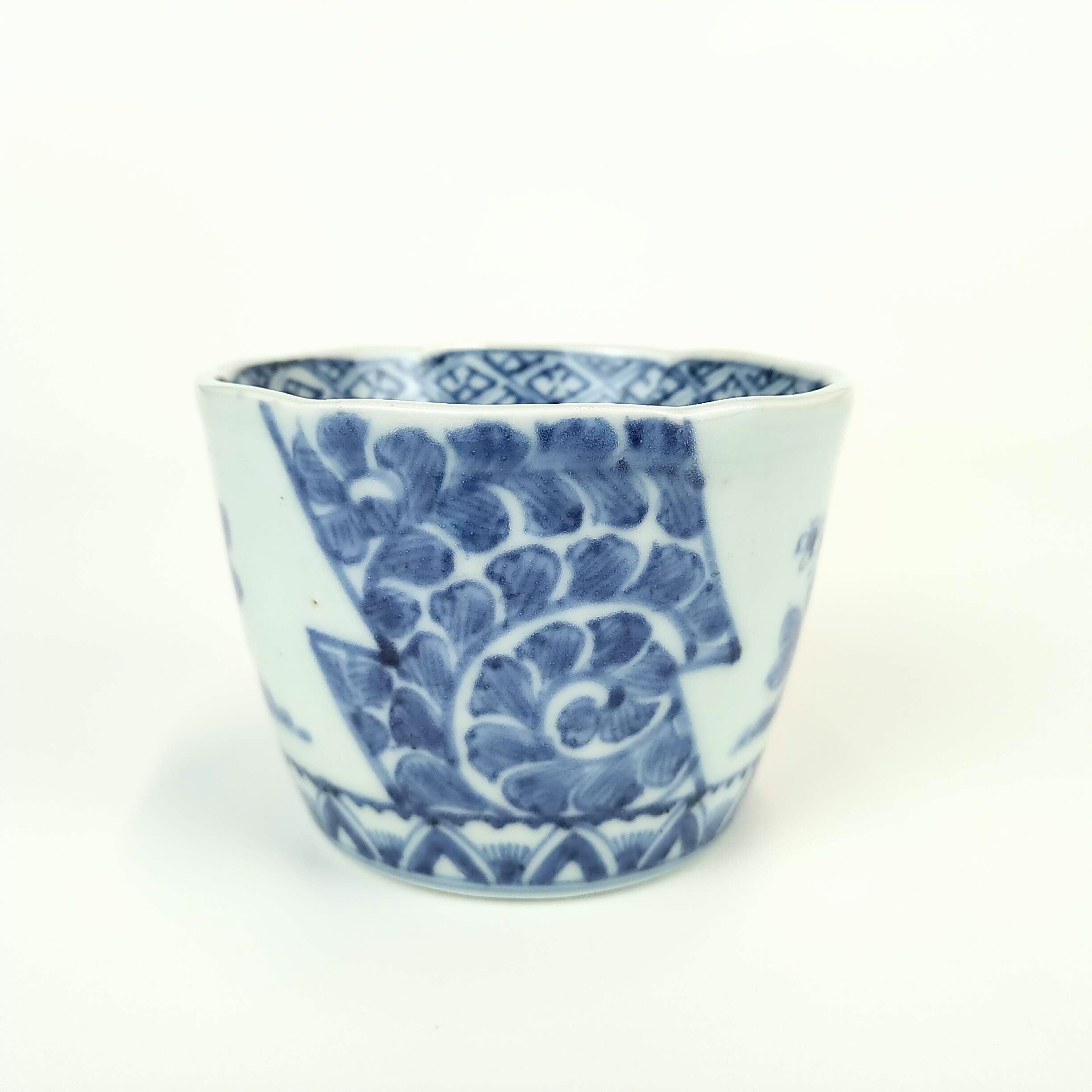 間を唐草文で埋め、剣先高台の上手のそば猪口です。